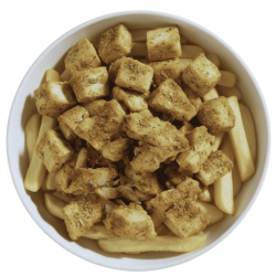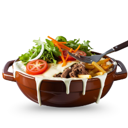 friet, kaas, saus en groenten