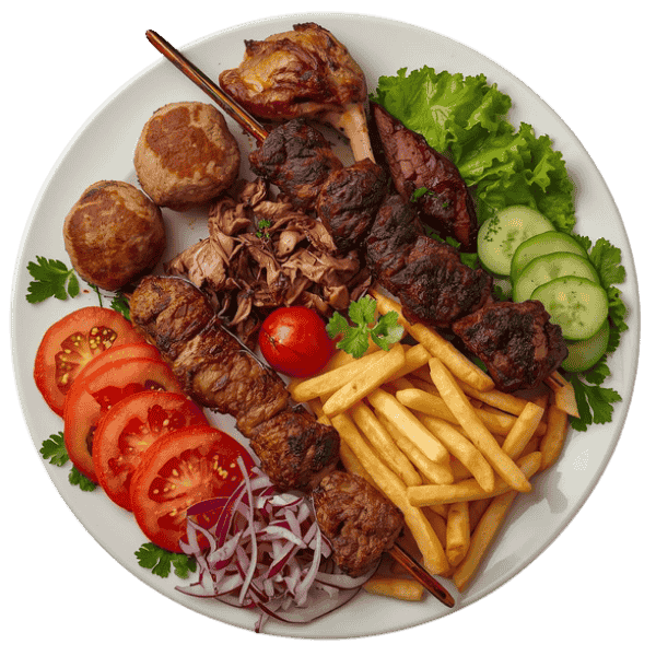 Groenten, frieten / rijst, 2 stuks köfte, 1 stuk adana, 1 stuk kip shish, 1 stuk lams shish, 1 lamskotelet