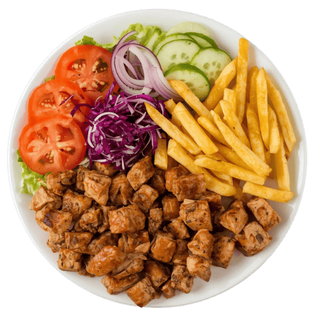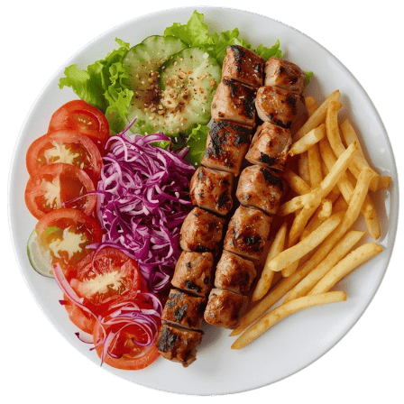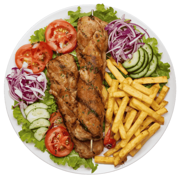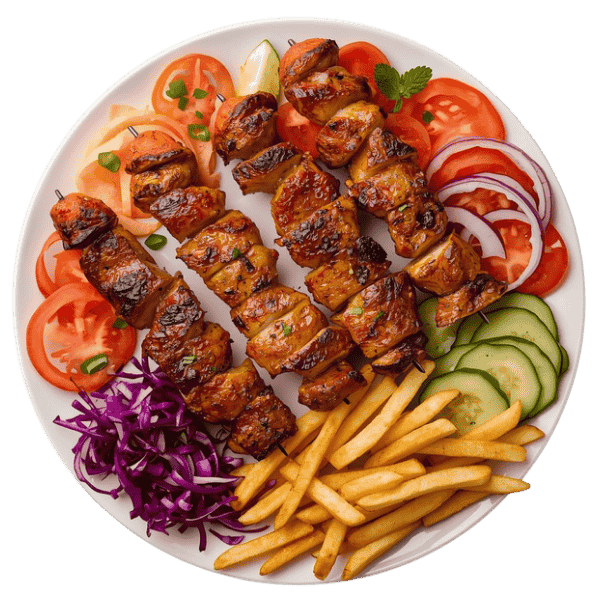 Groenten, frieten / rijst, 4 stukken sish kip kebab