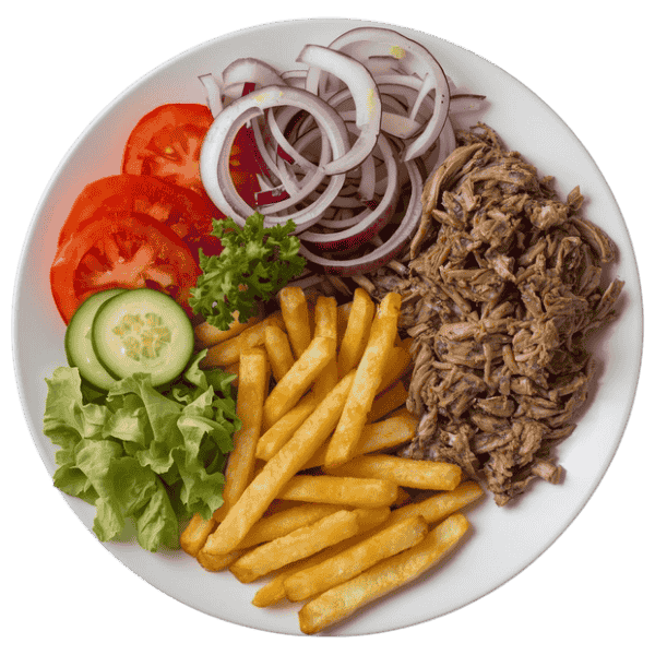 Groenten, frieten / rijst, 1 stuk köfte, 1 stuk adana, 1 stuk kip shish, biefstuk